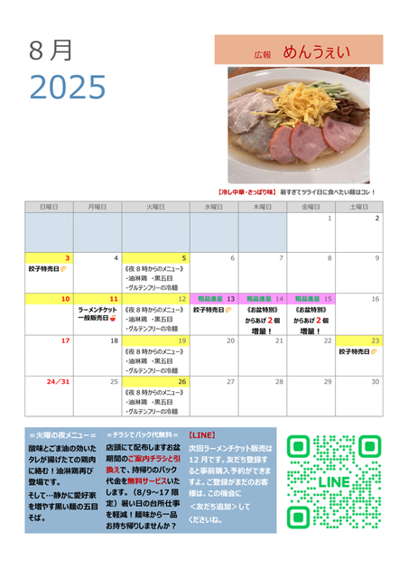 8月に入り、早くも5日目。 「広報がUPできてないぞ!」とボスに指摘されて 慌てて取り掛かりました、中の人です🙇♀️ 今月は ラーメンチケットのLINE会員様優先販売 お盆(14,15日)限定・からあげ2個増量 ラーメンチケット一般販売 お盆期間中・粗品進呈(限定500個) 等 色々とごちゃごちゃ書いてあります💦 また、店頭では9日から使える...