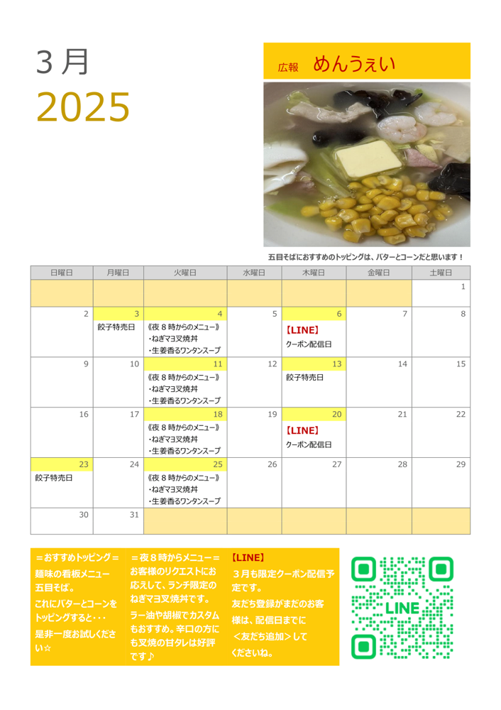 2月の半ばにコソ〜っと作り始めた お知らせカレンダー 【広報めんうぇい】 入り口でなんとな〜く 目を留めて下さるお客様がいらっしゃるので 4月版も作りました♪ ・今月はLINEクーポンを2回配信 ・火曜日夜8時からのメニューは 『えび炒飯』と『黒五目そば』です 早速今晩からですので、 ご来店お待ちしております🍜