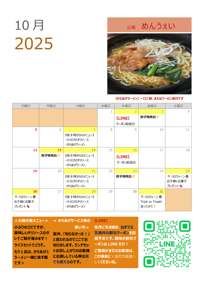 既に店頭では掲示されていますが、、、 ホームページの更新をウッカリ💦 すみません🙇♀️ 今月は 【火曜日夜8時から】 えびチリとからあげラーメン 【イベント】 お子様にハロウィン🎃お菓子 ✨31日のハロウィン当日だけは 「Trick or Treat!」と言って(つぶやいて)くれた 大人の方にもお菓子🍪プレゼントします🍭 仮装は必要ありませんが...