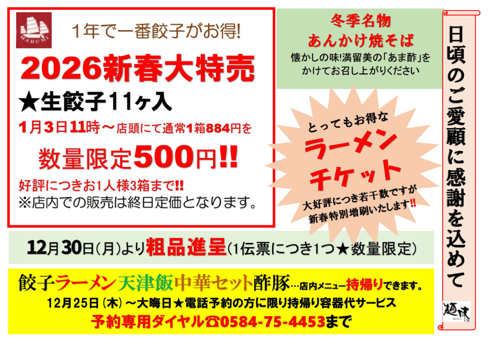 明けましておめでとうございます🍜 3日より通常営業しております 5日遅れのカレンダー更新ですみません😓 タイトル下にあります通り 今年で創業77周年です 本年も変わらぬご愛顧を賜りますよう お願い申し上げます。 スタッフ一同努めて参ります🙇♀️ 麺味店主🥟