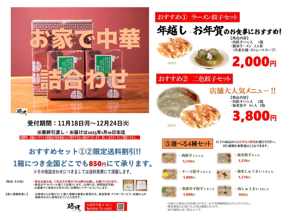 麺味の餃子、焼売、春巻を クール便でお届けします🚚 今期はラーメン🍜が入ったセットもあります。 店頭でお受け取りも可能です。 (事前のご予約が必要です) ご利用お待ちしております🥟
