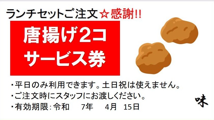 いつもご来店下さるお客様に、 感謝の気持ちを込めて… ギョーカイの決めた「ラーメンの日」に少しのっかって。 毎月11日を【麺の日】として 200円の値引券をお渡しします。 *ご利用金額1,000円以上のお客様に1枚進呈。 翌日よりお使い頂けます。
