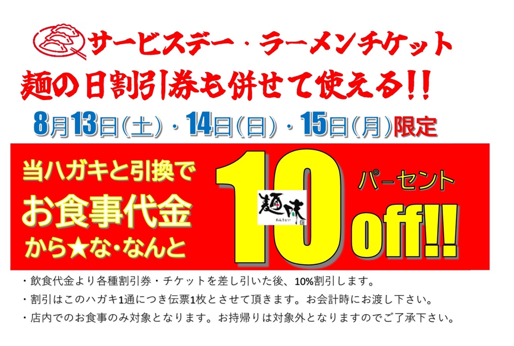 お盆です❗️ 餃子特売日です‼️ このハガキが届いているお客様。 ラーメンチケットをご購入下さったお客様。 麺味の日サービスチケットをお持ちのお客様。 ✨✨全部同時に使えます✨✨ 一年で一番お得に麺味でお召し上がり頂けます‼️‼️(多分💦) 🥟ご来店お待ちしております🍜 *ハガキは届いたことない!と言うお客様。...