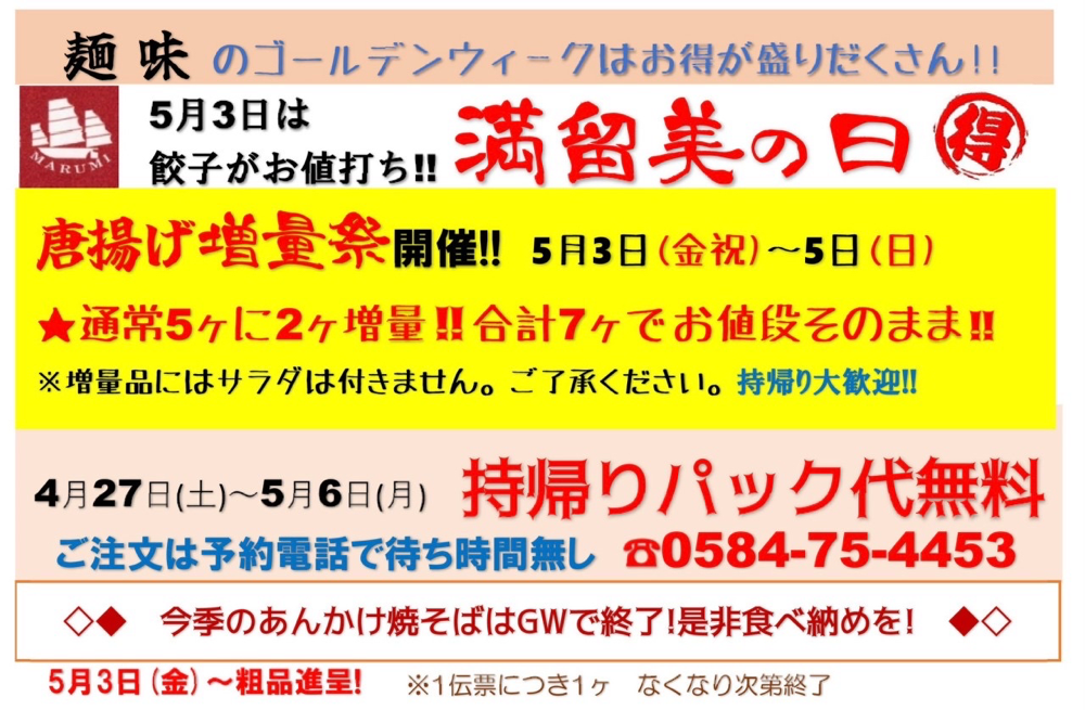 5月2日(木) カレンダー通りに仕事のある方は、 中3日の勤務お疲れ様です。 明日から4連休ですね! 麺味はモチロン絶賛営業中です💪 中休みありませんので、 いつもと違うサイクルで「アレ?ご飯食べ損ねた」 と言うお客様に重宝して頂いております🍜 お持ち帰りも、この後の連休中はパック代無料❗️ 地味ぃ〜に財布を直撃してくるパック代無料‼️デス。...