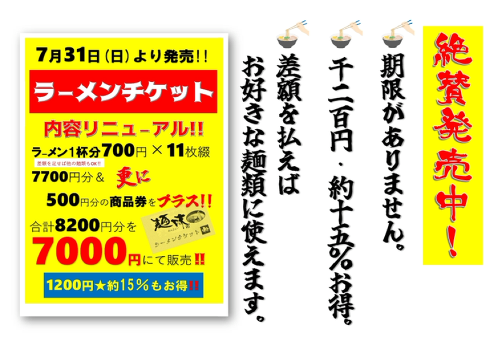 今夏の ラーメンチケット残り8冊です‼️ 1冊 7,000円 《セット内容》 ラーメンチケット(700円)× 11枚 特典チケットは 500円の商品券 1枚 合計8,200円分です✨ ◉お得その1 購入したその場で使えます。 ◎お得その2 セットのチケットは、全て使用期限ナシです。 ◇万一、ラーメンが値上がりした場合も、 差額のお支払は必要はありません。...
